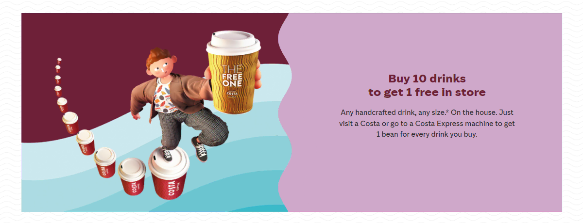 Costa Coffee, a popular UK-based coffeehouse chain, is known for its high-quality handcrafted coffee, friendly service, and cozy atmosphere. Their rewards program is designed to keep customers coming back by making every visit feel rewarding and fun. But here's the twist: they use gamification to keep it exciting. For example, customers can earn a free drink after purchasing ten drinks, encouraging them to visit more frequently. It's like a little game that makes their coffee runs more engaging.