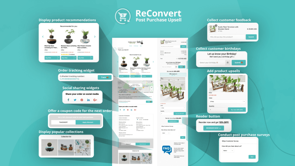 ReConvert is a simple yet powerful app that empowers you to build customized thank-you pages for your Shopify store. Use it to boost your AOV via post-purchase upsells, countdown timers, and related products. Plus, enhance your retention with post-purchase surveys, a re-order button, and more. With an intuitive drag-and-drop page builder, advanced analytics, and powerful integrations, there's no reason not to join 28,000+ other merchants who are maximizing their revenue with ReConvert today.