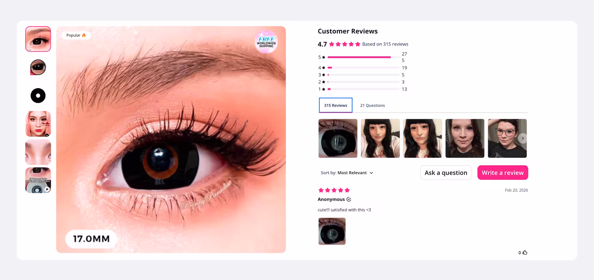 PinkyParadise implemented Growave to strengthen trust and engagement across the customer journey. Through Growave’s review features, the brand enabled customers to share photo-based reviews, giving shoppers real visual proof of how colored contact lenses appear across different eye colors and styles. This created a more transparent shopping experience and helped customers better understand how products look in real-life use.