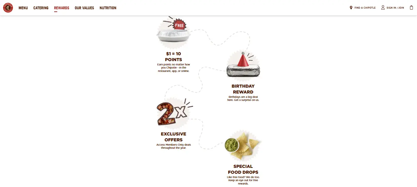 El programa de fidelización es gratuito y está diseñado para recompensar a los comensales frecuentes con beneficios significativos. Los miembros ganan 10 puntos por cada dólar que gasten, ya sea que hagan un pedido en la tienda, en línea o a través de la aplicación Chipotle. Estos puntos se pueden canjear por una amplia variedad de recompensas, desde entradas y bebidas gratis hasta ofertas exclusivas y productos del menú.
