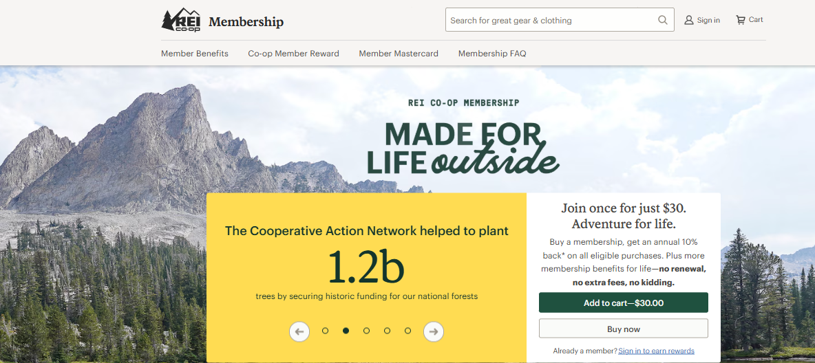 La membresía de REI Co-op cuesta 30 dólares por única vez programa de suscripción que convierte a los clientes en miembros vitalicios de una comunidad centrada en la aventura al aire libre.